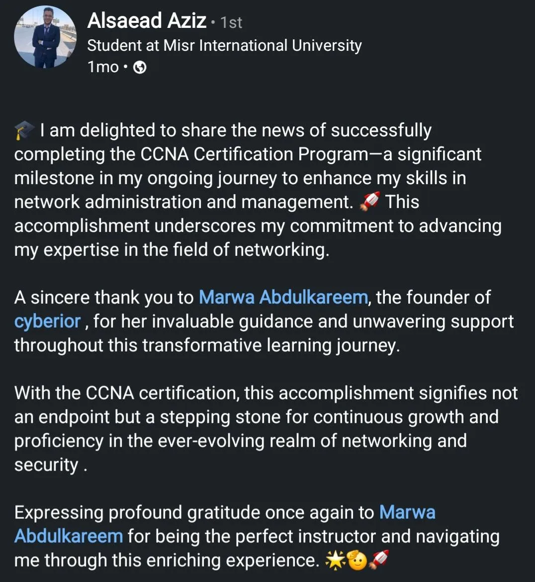 من أبرز الأسماء في تعليم الأمن السيبراني في العالم العربي، تجمع بين الخلفية الأكاديمية والخبرة العملية. مؤسِّسة منصة Cyberior المتخصصة في تبسيط الأمن السيبراني للمبتدئين باللغة العربية.